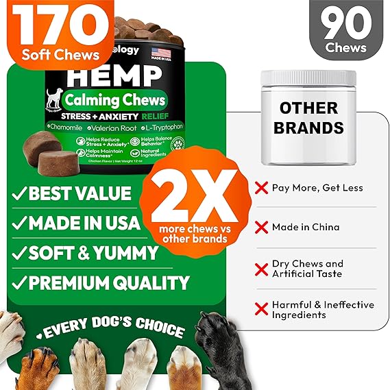 Hemp Calming Chews for Dogs - 170 Dog Calming Chews - Anxiety Relief Treats - Advanced Stress Relief Supplement, Separation Aid, Barking, Fireworks, Melatonin - Hip & Joint Support - Made in USA