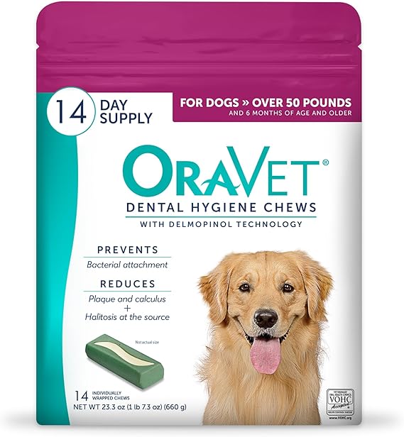 The #1 dental chew vets give to their own dogs,1 ORAVET Hygiene Dental Chews for Dogs provide the at-home dental care that your dog deserves. Each dental chew uses your dog's own chewing action to loosen and dislodge plaque, helping it break away from teeth and is clinically shown to reduce plaque and tartar build-up to promote oral health.2 ORAVET Dental Hygiene Chews are also the only dog dental chew that contains the ingredient delmopinol, used in human oral care rinses. Delmopinol coats the teeth, creating a protective barrier against the bacteria that lead to the formation of plaque, tartar, and bad breath. Give your pet one tasty, highly dissolvable chew daily for cleaner teeth and fresher breath. Each 30 Count bag of ORAVET Dental Hygiene Chews provides a full month of dental protection when used daily to help keep your dog’s mouth clean. Along with regular veterinary dental checkups, ORAVET Chews are designed for your dog’s daily dental home-care routine to promote good oral health. ORAVET Chews are made for dogs and puppies six months of age or older weighing 3.5 pounds or more. Subscribe & Save today to make it easier to keep your dog’s mouth clean year-round and make sure you never run out of ORAVET Dental Hygiene Chews. Be sure to visit our brand store and follow us to stay up to date on new products, features, tips and more. (1,2 Data on file at Boehringer Ingelheim.)