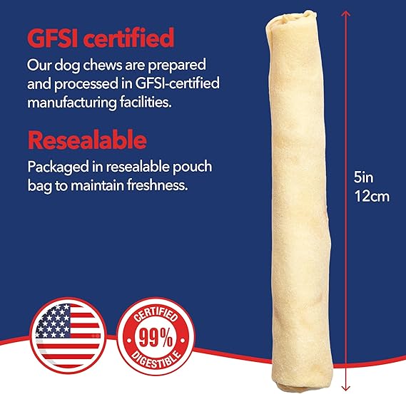 Superior USA-Made Quality: Give your dog the finest with these natural rawhide chews for dogs, crafted from 100% American raised, corn fed cattle. These safe rawhide chews for dogs are made in a regulated facility following strict safety standards, so you can feel confident about what you're giving your furry friend. No dangerous additives or preservatives—just pure, natural rawhide for dogs That's thick, durable, and 99% digestible for peace of mind. Ideal for Serious Chewers: These dog chew rawhide treats are designed for dogs who love to chew, providing a safe outlet that satisfies their natural instincts. The thick American beef rawhides for dogs are long-lasting and durable, keeping your pup happily occupied while redirecting them from chewing your furniture or shoes. These rawhide dog treats give your dog the satisfying chewing activity they crave in a healthy, constructive way. Supports Healthy Teeth & Gums: Turn chew time into dental care time with these dental rawhide chews for dogs. As your dog enjoys these dog rawhide chips, the natural chewing action helps scrape away plaque and prevent tartar buildup, promoting healthier teeth and gums. These dog dental rawhide chews make maintaining your Pet's oral health easy and enjoyable - no more struggling with toothbrushes when your dog can clean their teeth naturally while having fun. -100% USA Made-Thick Beefhide Chews-Promotes Dental Health-99% Digestible-Small-Medium Dogs