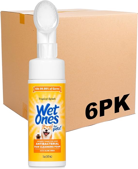 Wet Ones for Pets™ Antibacterial Dog Paw Cleansing Foam with Built-In Paw Scrubber Brush makes it easier than ever for busy pet parents to clean dirty dog paws anytime, anywhere. Simply squeeze the bottle to release the antibacterial foaming solution directly into the built-in scrub brush head to clean off your dog’s paws and scrub away dirt and debris, leaving behind clean paws with a pleasant Tropical Splash fragrance. Wet Ones for Pets™ uses special antibacterial cleaning formulations just for dogs’ unique skin, killing 99.99% of germs. The foaming action of this dog foot cleaner helps distribute solution throughout the scrub brush head, as well as helping to lift away dirt and debris from between dogs’ toes. This dog paw cleaner with foaming solution includes a built-In scrubber, making it an all-inone paw cleaning scrub bottle. Wet Ones for Pets™ know what pet parents love and need most for nose to-toe-to-tail clean-up! Keep a bottle in your car for road trips, hiking, or everyday walks at the dog park! Perfect for new puppy supplies or to have on hand for a rainy day to clean up muddy paws coming in from the back yard! When pet parents need quick and easy solutions for on-the-go cleaning and refreshing, they reach for Wet Ones for Pets™! Be sure to shop all of our convenient pet clean-up solutions from Wet Ones for Pets™ for everything pet parents need most for nose-to-tail clean-up!