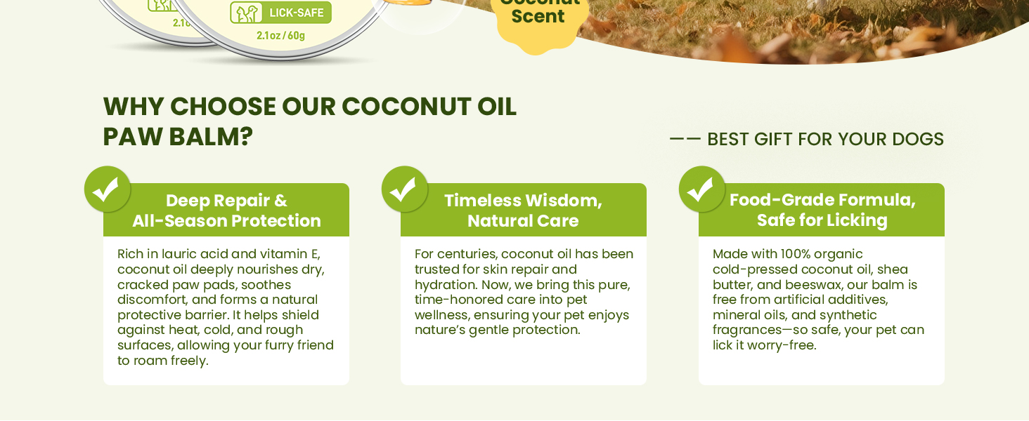 - LICK-SAFE 8-IN-1 NATURAL BLEND:Our dog paw balm is crafted with food-grade ingredients, making it safe even if licked by your dog. It’s rich in Coconut Oil for deep hydration and a naturally soothing coconut scent your pup will love. We also blend in Shea Butter to calm, Olive Oil to soften, Aloe Vera to reduce inflammation, Sunflower Seed Oil for extra moisture, and Vitamin E for added protection