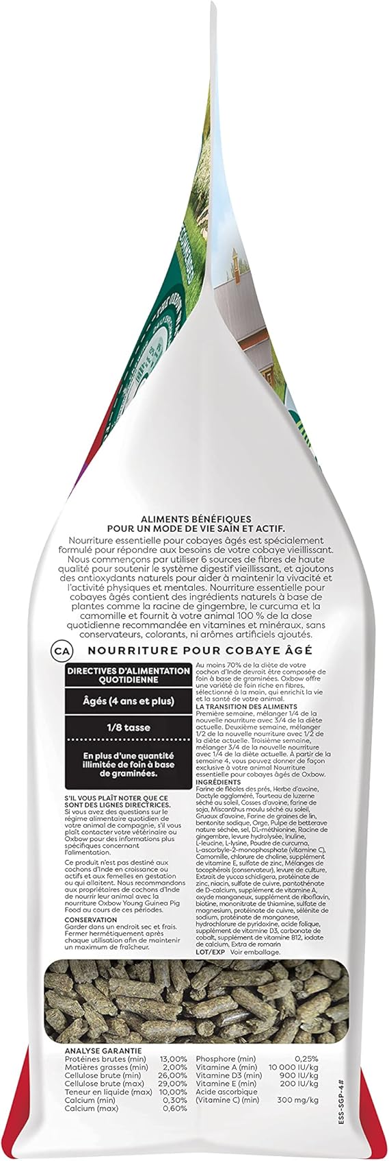 Oxbow’s Essentials - Young Guinea Pig Food is formulated to meet the specific nutritional needs of young, pregnant, and nursing guinea pigs and help them thrive. This complete and balanced young guinea pig food contains Alfalfa hay to provide optimal energy and the fiber essential for healthy digestion. We then add wholesome ingredients and vital nutrients to meet the growth, energy, pregnancy, and nursing needs of guinea pigs. FEEDING INSTRUCTIONS: Young (under six months), Pregnant/Nursing - Unlimited Feed in addition to unlimited grass hay. Alfalfa hay may be given in small quantities. Please note that these are guidelines. At Oxbow Animal Health, our purpose is to help people and pets live happy, healthy lives. For more than 30 years, we’ve partnered with leading veterinarians and nutritionists to develop nutrition and care products that meet the specific species and life stage needs of rabbits, guinea pigs, chinchillas, hamsters, gerbils, rats, and mice. From farm-fresh hays and nourishing fortified foods to wholesome treats, beneficial supplements, enrichment and care, Oxbow products are used and recommended by leading veterinary professionals and passionate pet parents worldwide. At Oxbow Animal Health, our purpose is to help people and pets live happy, healthy lives. For more than 30 years, we’ve partnered with leading veterinarians and nutritionists to develop nutrition and care products that meet the specific species and life stage needs of rabbits, guinea pigs, chinchillas, hamsters, gerbils, rats, and mice. From farm-fresh hays and nourishing fortified foods to wholesome treats, beneficial supplements, enrichment and care, Oxbow products are used and recommended by leading veterinary professionals and passionate pet parents worldwide.