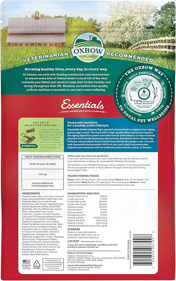 Oxbow Essentials Guinea Pig Food, Adult Guinea Pig, Made with Oxbow Timothy Hay, Pet Food Pellets with Vitamin C, Small Animal Pet Products, Made in USA, High Fiber, 10 lb. bag
