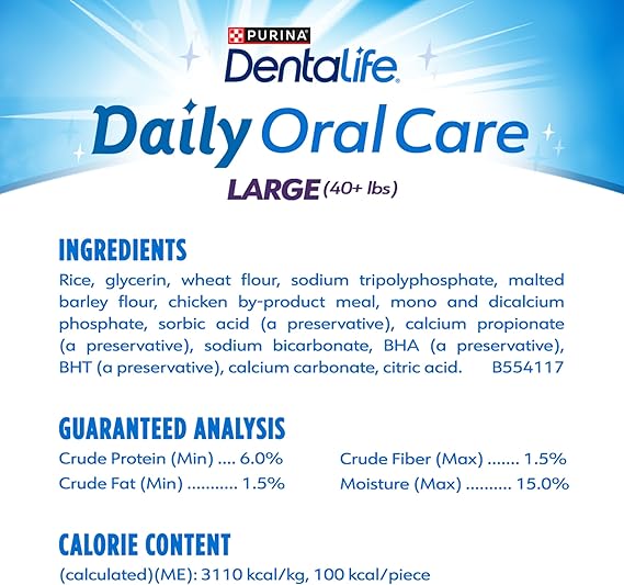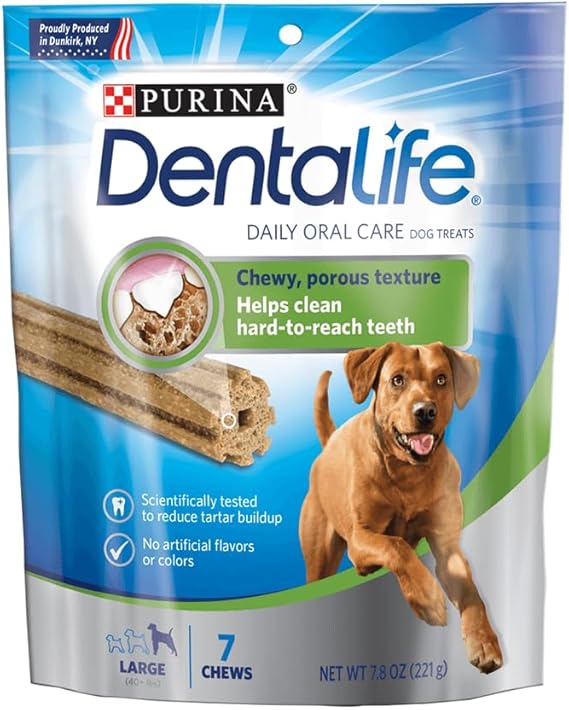 Part of caring for your dog's health is helping him to maintain healthy teeth, and Purina DentaLife Daily Oral Care large adult dog treats help clean his teeth. The tasty chicken flavor keeps him excited about snack time, while the wholesome ingredients let you feel good about serving these treats to your dog. With a formula that's scientifically tested to reduce tartar buildup, these VOHC (Veterinary Oral Health Council) accepted treats help to deliver a breakthrough clean that keeps your large dog's breath fresh. The innovative design, which contains eight distinct ridges plus thousands of air pockets that produce a porous, chewy texture, cleans his teeth right down to the gumline. Featuring a large size designed with large dogs in mind, these adult dog treats are packaged in a convenient resealable pouch, helping to preserve freshness. Let him know you care about his teeth every time you reach for a pouch, and support his smile throughout a long, healthy life together.