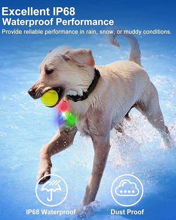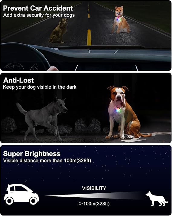 - 【4 Modes Dog Walking Light】Our upgraded dog light offers 4 RGB color-changing modes: white light, red light, color light, red light flashing. you can choose different light mode according to your needs. Besides, you can uses different light to distingush different dogs if you have multiple dogs to walking at night time. Featuring 7 powerful LED beads that provide up to 80LM brightness, this helps prevent accidents and ensures that your dog can be seen in the dark. Giving you peace of mind of knowing your dog's location.