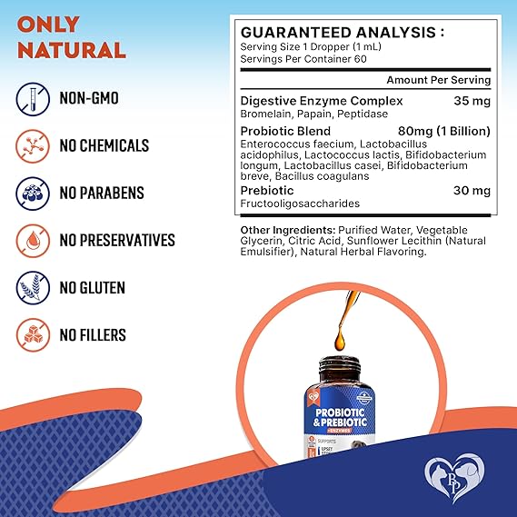 - HOLISTIC DOG & CAT PROBIOTICS blend enriched with enzymes and prebiotics, is meticulously formulated to promote comprehensive gastrointestinal health and can be an excellent replacement for pills and probiotic & prebiotic treats. This liquid supplement not only do its alleviate itching and support tummy comfort, but it also ensure healthy poop consistency, addressing multiple facets of your pet's digestive well-being.