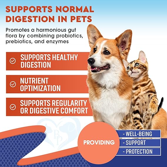 - Best Comprehensive Gastrointestinal Support: Whether for dogs or cats, including kittens, our probiotic supplements, enriched with enzymes and prebiotics, provide holistic care for your pet's gastrointestinal system. With a focus on overall well-being, they ensure that your beloved companion thrives with a happy and healthy gut.