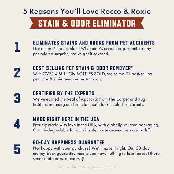 - Buy With Confidence: You want the best for your best friend; we do, too; if you are not satisfied with the performance of this Rocco & Roxie stain & odor eliminator, contact us; we are determined to make it right