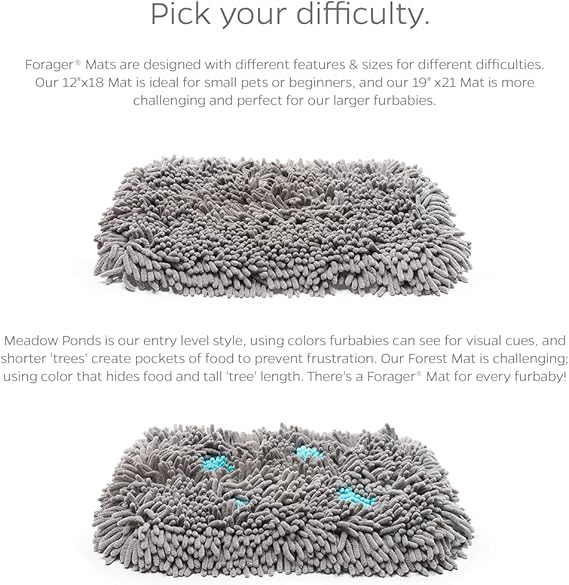 - VISUAL STIMULATION - Take meal time with your furbaby to a whole new level with the enrichment benefits that come with the Forager Mat. With ponds in our meadow mats, your furbaby will be able to forage through the mat to find little pockets of visual stimulation, but also little pockets of treats within the foraging meadow.