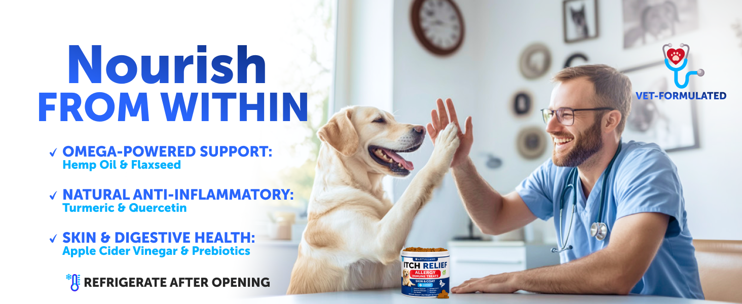 - Formulated with Love: we made chews for allergy relief for dogs itching with natural ingredients and free of added sugar, wheat, & corn. Tasty dog skin and coat supplement is a great aid for dogs of all breeds & ages.