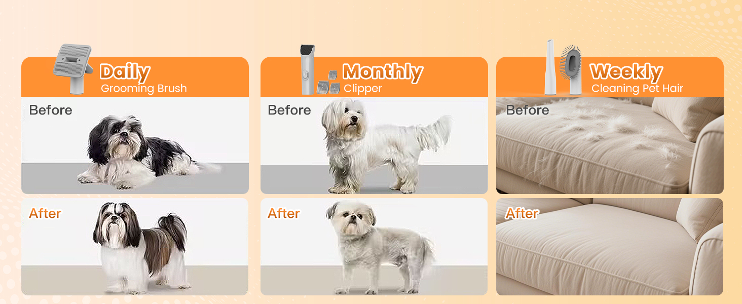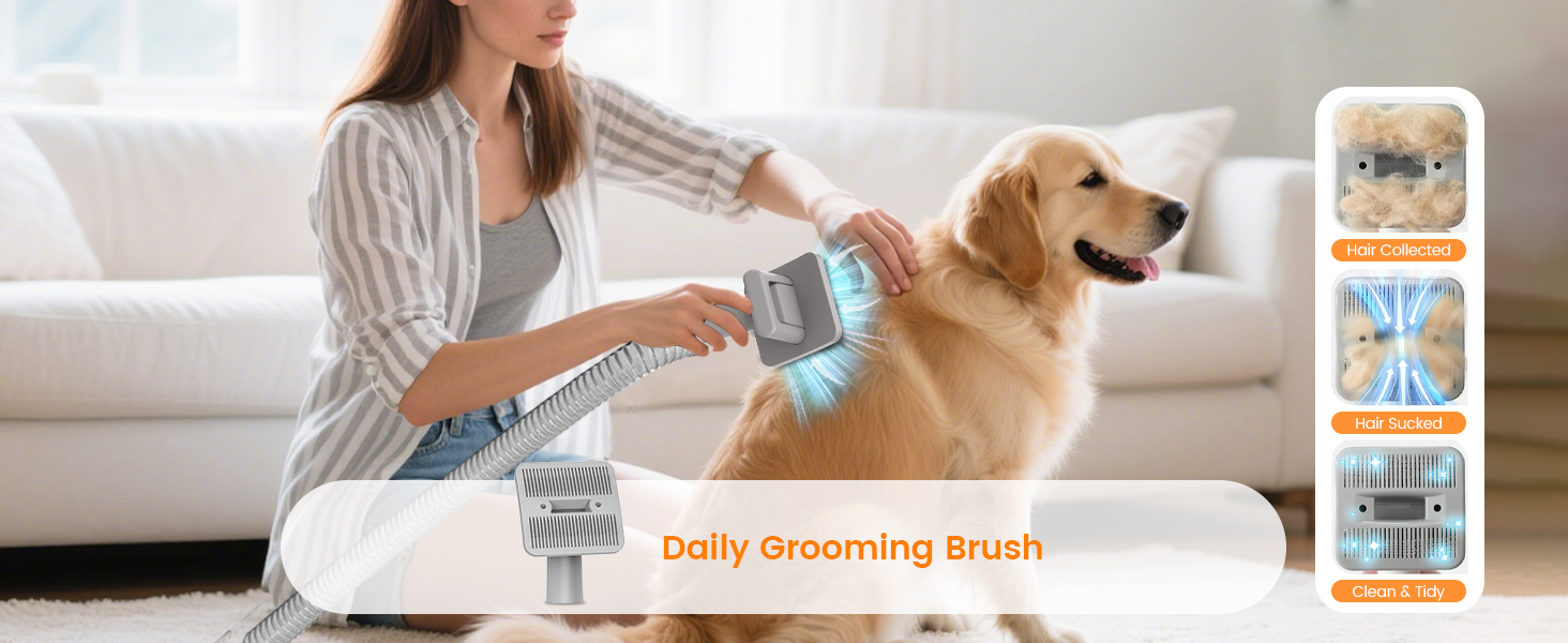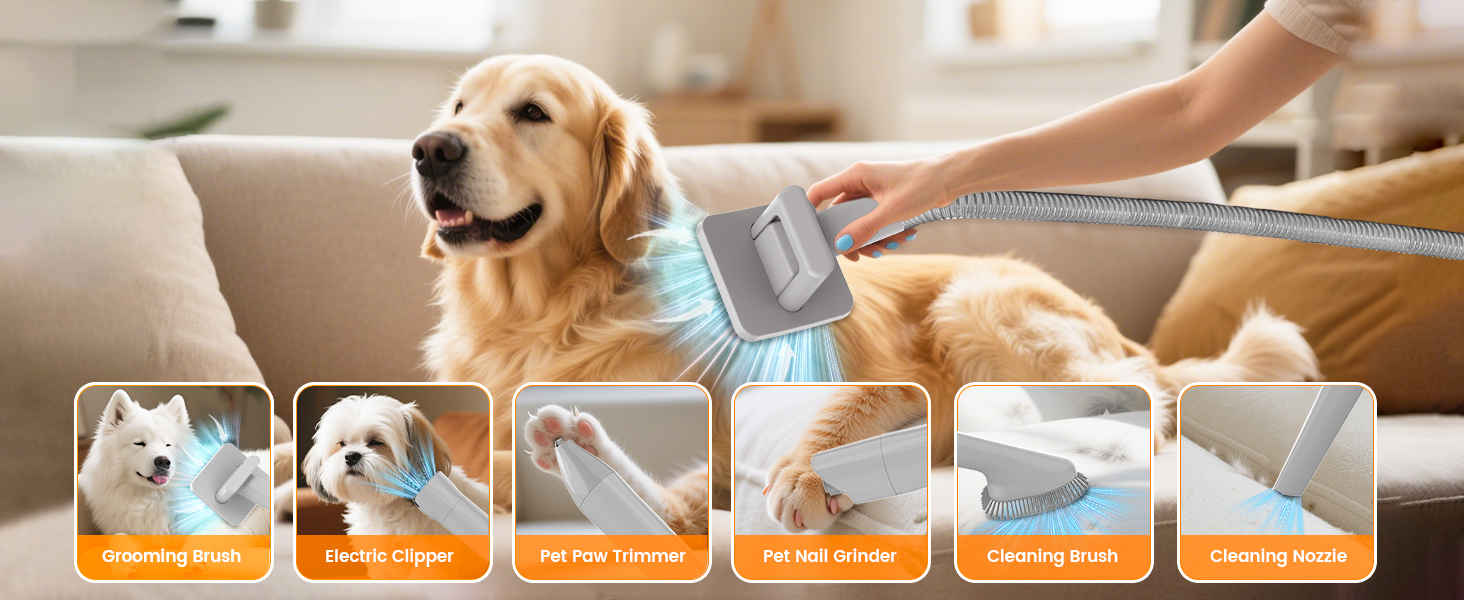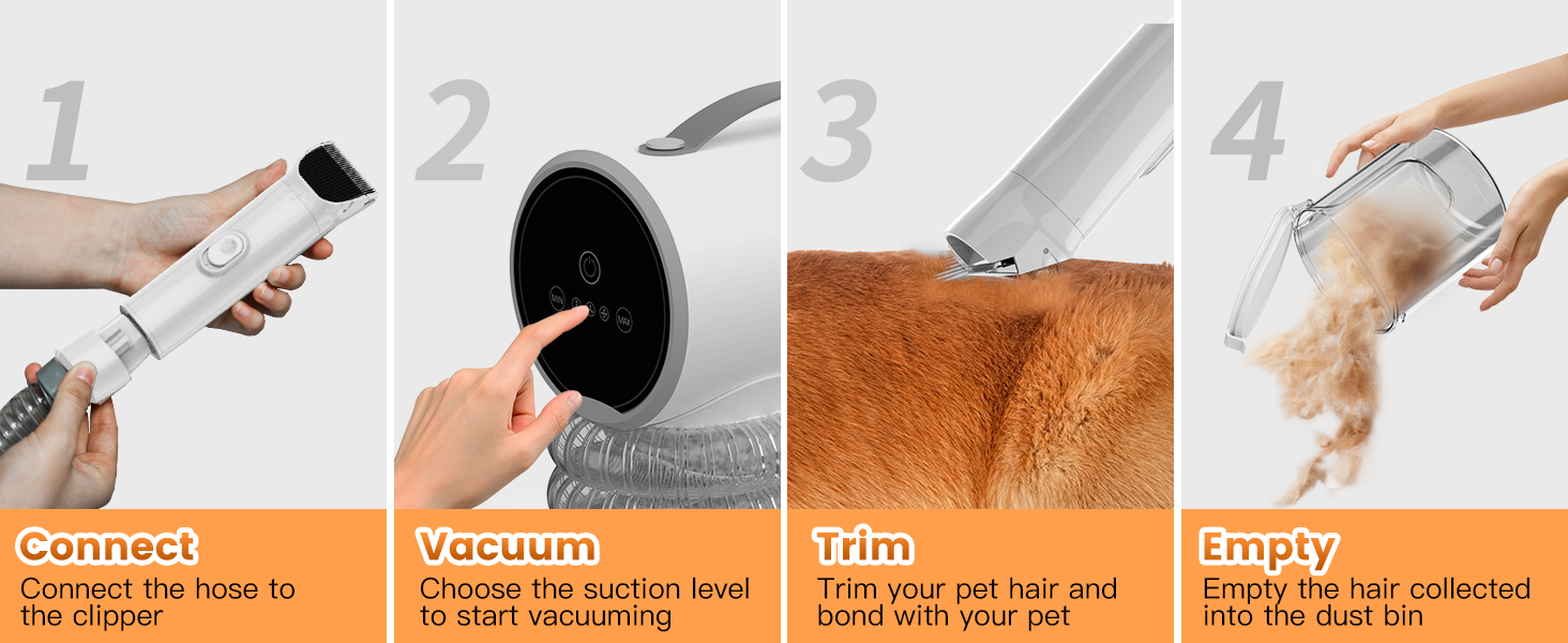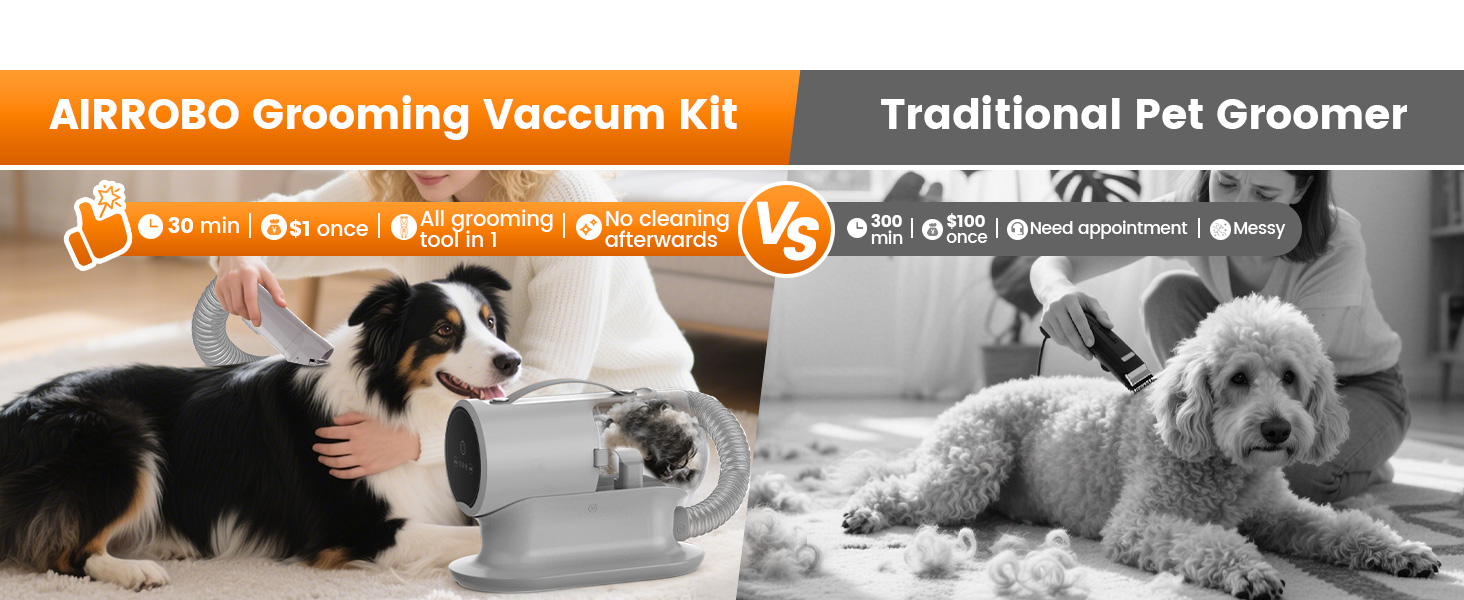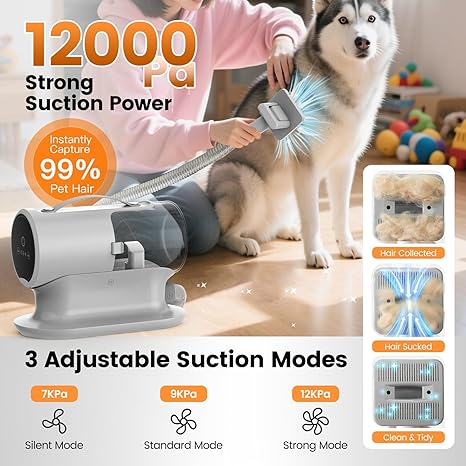- DOG GROOMING VACUUM WITH 12000PA STRONG SUCTION POWER- Our dog grooming kit with vacuum function can suck up to 99% of pet hair into the dust box as you groom, preventing pet hair from spreading and creating a mess. Say goodbye to hair-covered furniture and hello to a tidy, fur-free home.