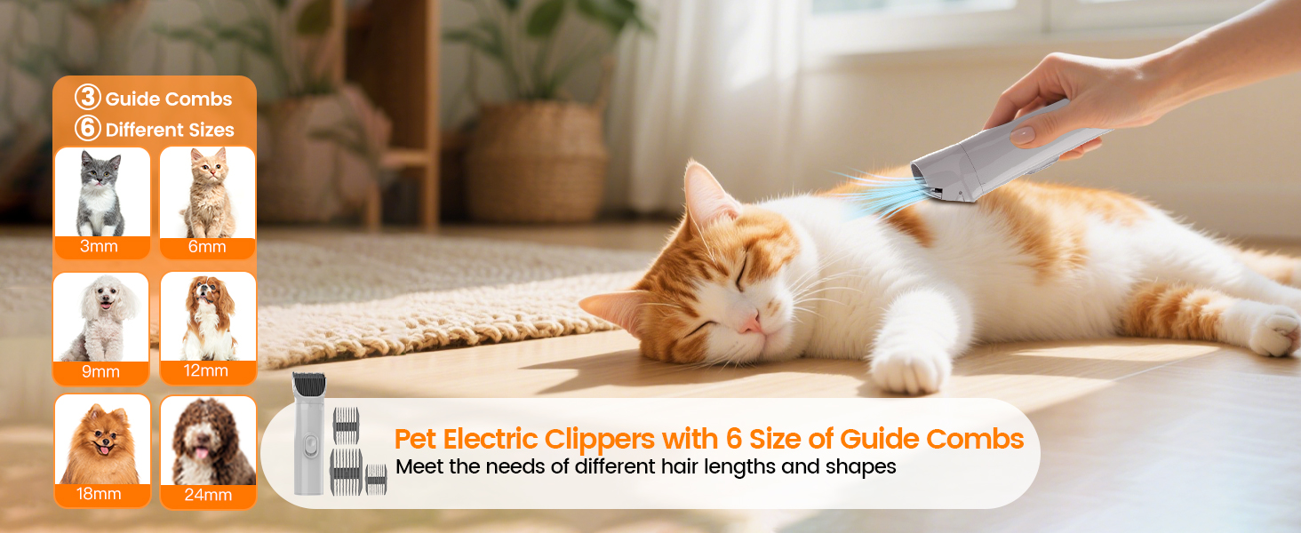 - MULTIPLE GUIDIE COMES - 6 different-sized guide combs(3mm & 6mm & 9mm & 12mm &18mm & 24mm) can be used to trim pet hair of different lengths. This allows you to achieve the perfect look for your pet, regardless of their hair length.