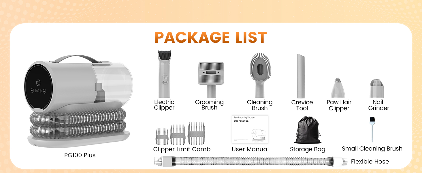 - 7-IN-1 PET GROOMING KIT AND VACUUM-Model PG100 PLUS Dog Vacuum Grooming Kit includes a vacuum, electric clipper, grooming brush, crevice cleaning tool, cleaning brush, and adds a pet paw trimmer and nail grinder compared to the PG100 model. Achieve one-stop pet care for your pet in the comfort of your home, providing a professional-quality grooming experience! Save you time and money on trips to the pet grooming salon.