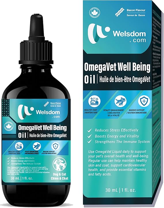 Pets OmegaVet Well-Being Oil for Pets - 30mL | High Omega-3 & Vitamin Blend | Supports Skin, Coat, Heart, & Immune Health | Bacon-Flavored Liquid Formula