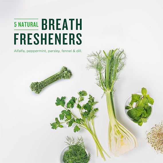 Put treat time on repeat with Minties® FreshBites! At just 7.5 calories, these dental treats are perfect after meals, as a midday snack, or anytime your pup needs a quick breath refresher. The delightfully chewy texture softens with every bite to gently freshen your dog’s breath and clean their teeth. Each treat is made with 5 natural breath fresheners: alfalfa, peppermint, fennel, dill, and parsley—powerful herbs that are known to help neutralize odors in the mouth and stop stinky breath! Packed with a natural chicken flavor, these dental chews will win over even the pickiest of dogs. It’s the kind of dental treat that you’ll feel good about giving to your pup, again and again!