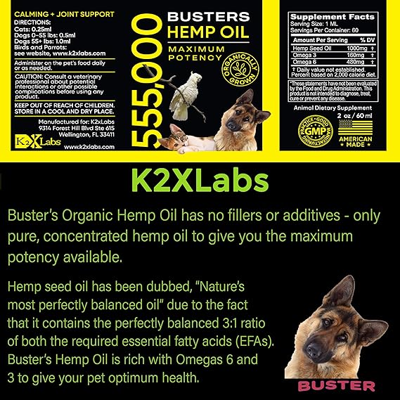 - Buster uses k2xlabs proven process - safety meets results: we leverage only proven, advanced cold extraction methods, meticulously testing for safety, purity, potency & effect, then send only the best; ensuring your pet receives the optimal omega-9,6 and 3 balance, flavonoids, vitamins a and d, phytochemicals, and arthritis mitigating properties others filter away.