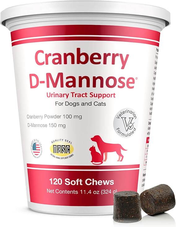 Cranberry D-Mannose Urinary Tract Support Supplement for Cats and Dogs - Cranberry Extract, D-Mannose, Vitamin C - Bladder and UTI Treatment - Made in USA - 120 Soft Chews