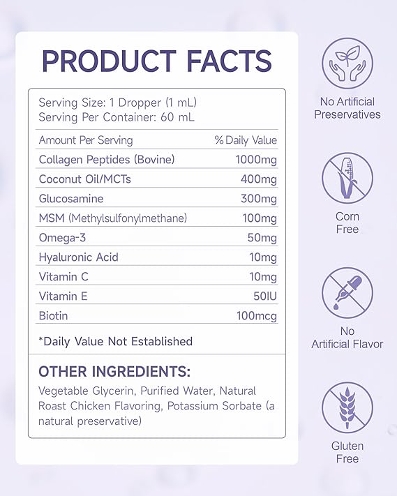 - Convenient and Simple Application : These collagen drops for dogs come in a tasty roast chicken flavor that most dogs enjoy. You can administer the dog collagen supplement directly into your dog's mouth or mix it with their regular food, milk, or water. This makes supplementation easy and ensures your dog can get the nutrients conveniently