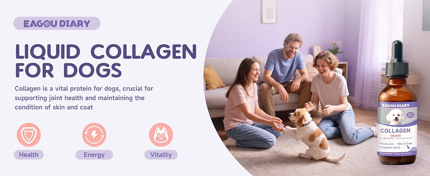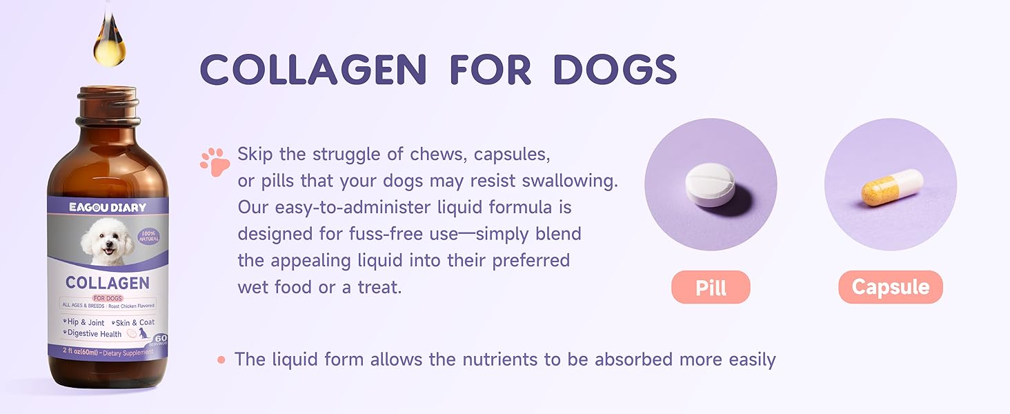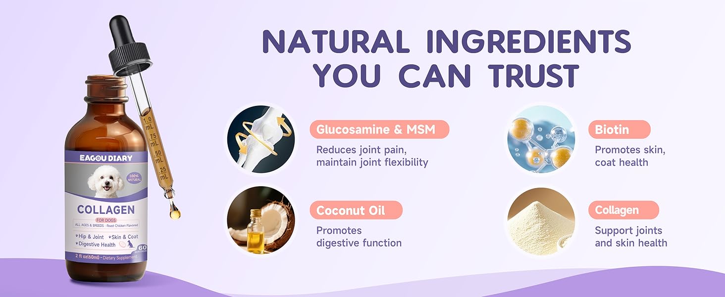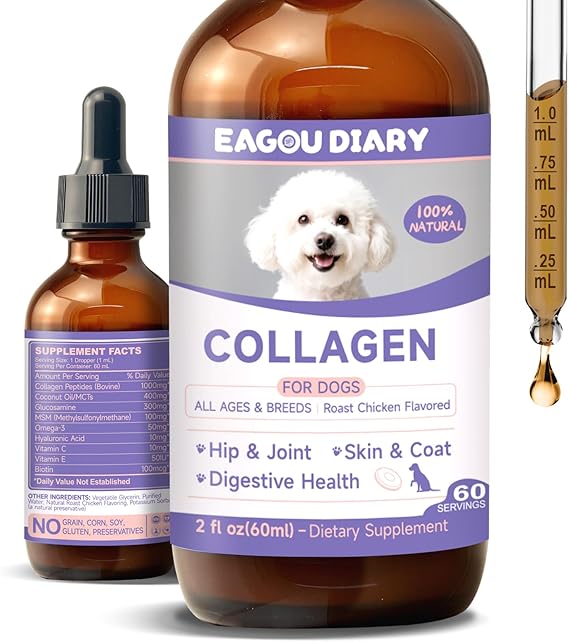 Eagou Diary Collagen for Dogs - Dog Collagen Drops with Glucosamine, MSM, Coconut Oil, VitaminC & E, Biotin - Hip & Joint Support, Skin & Coat Health, Gut & Immune Health, 60ml