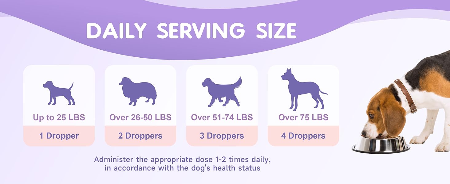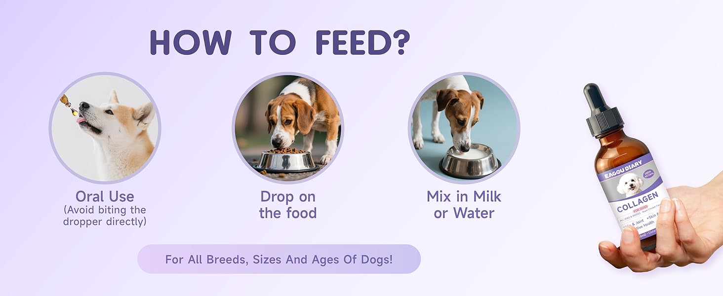 - Suitable All Ages and Breeds : Whether you have a playful puppy, a energetic adult dog, or a senior dog looking to maintain its health, our dog collagen drops are designed to meet their nutritional needs. It's suitable for all dog breeds, regardless of their size or age, providing them with the essential nutrients to support their active lifestyle and overall health