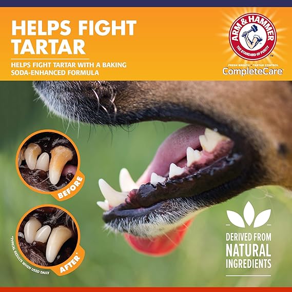 Unleash the power of baking soda with Arm and Hammer pet dental products. Arm and Hammer for Dogs products leverage the power of baking soda to clean gently and deodorize naturally. Arm & Hammer Complete Care Enzymatic Dog Dental Kit offers an advanced formula, enriched with baking soda and calcium plus calcium, The enzymatic puppy toothpaste included in this kit offers a complete care solution that is fluoride-free and nontoxic, ensuring a gentle yet effective clean for your pet's teeth. This tartar control formula helps reduce plaque buildup and maintain your dog's oral health when used regularly. The kit includes a 2.5oz chicken flavor toothpaste, a toothbrush with two sizes of brush heads, and a finger brush for convenient brushing. Our toothpaste for dogs is crafted with a delicious chicken flavor that dogs love, making it easier than ever to incorporate into your pet's daily routine. Plus, baking soda particles dissolve into hard-to-reach areas for lasting deodorizing and cleaning. With added calcium, this toothpaste for dogs is part of a complete dental care system. This product is cruelty-free and non-toxic, formulated without the use of any dyes. Trust the power of Arm & Hammer pet dental products for healthy pets and fresh kisses! DIRECTIONS - For first time brushers, put a small amount of toothpaste on your finger and invite your dog to lick. Use with any preferred dog tooth brush. Progress to rubbing your finger along the gum line and teeth. Once your pet is comfortable, put a small bit of toothpaste on toothbrush/finger brush and repeat the above steps. Always make teeth cleaning for dogs a positive experience for your pet.