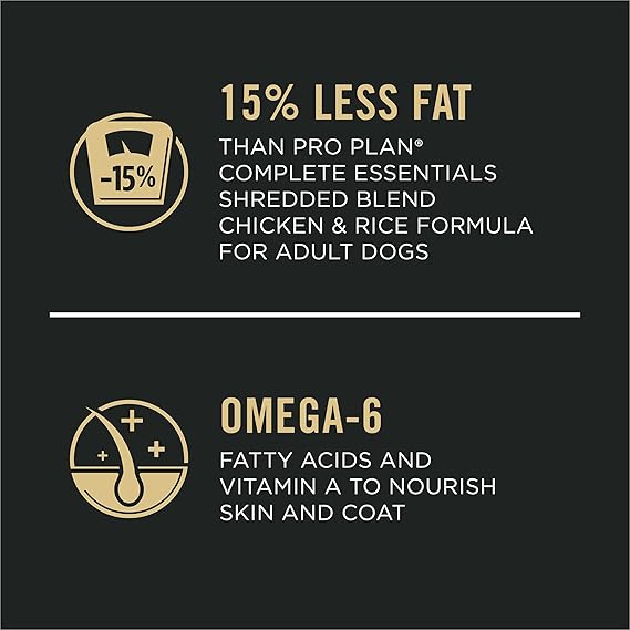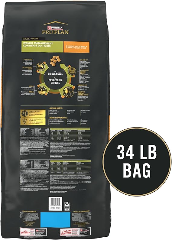 Support your dog's special nutritional needs with Purina Pro Plan Dog Food Weight Management Chicken and Rice Formula adult dry dog food. Each serving contains 15 percent less fat than Pro Plan ESSENTIALS Shredded Blend Chicken and Rice Formula for Adult Dogs, giving you a convenient way to help maintain your dog's healthy weight. Chicken as the first ingredient helps provide protein, one of the essential nutritional building blocks, and an optimal protein-to-fat ratio helps him maintain muscle mass during weight loss. Every high-quality ingredient in this healthy weight Purina dog food is carefully chosen for a specific nutritional or functional purpose, so you can feel good about the food you offer your canine companion. Formulated to provide 100 percent complete and balanced nutrition for overweight or less active adult dogs, this formula helps to support your dog's overall health and wellness so he can keep up with your active daily life.