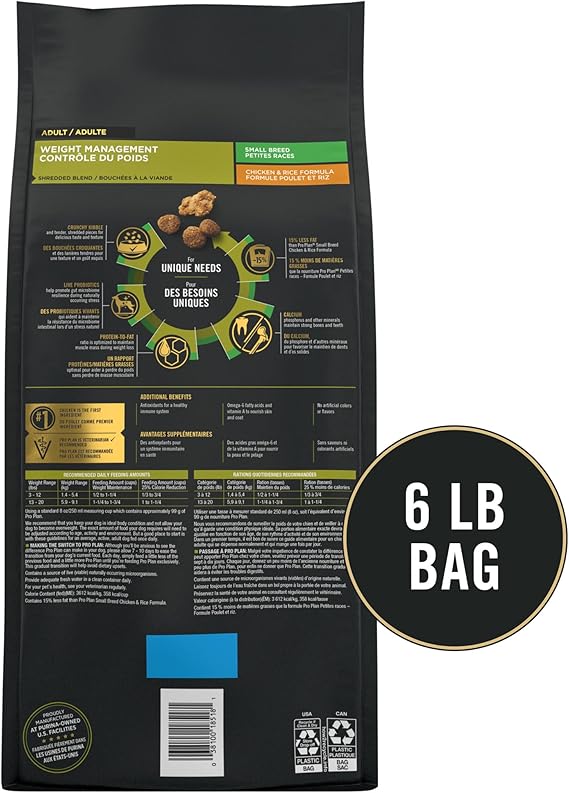Purina Pro Plan Small Breed Weight Management Dry Dog Food, Shredded Blend Chicken and Rice Formula - 6 lb. Bag