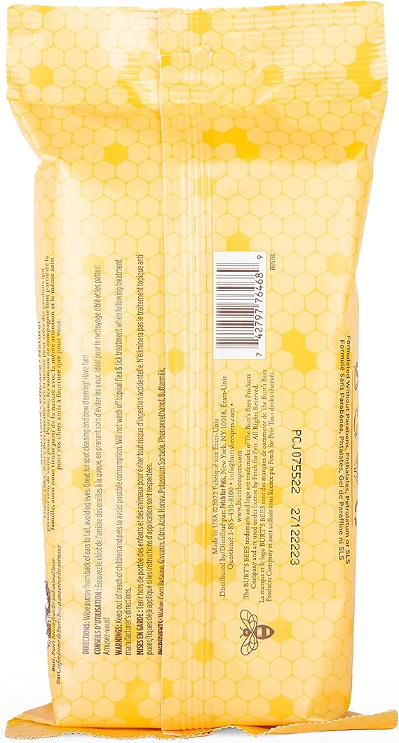 Since 1984, Burt’s Bees has been working with nature to create products that nourish your skin. With the same mission in mind, we created a custom formulated range of puppy grooming products to bring the same quality to the lives of our pets. Burt’s Bees™ for Pets™ Puppy Wipes are perfect for spot cleaning the skin and coat, reducing odors and unwanted smells. Leveraging the power of naturally derived ingredients, buttermilk gently cleanses puppies' fur and coat while honey acts as a conditioner and regulates the delicate pH unique to pets, delivering a high shine finish. All our dog grooming products utilize a minimum 95% natural origin formulas and are formulated without chemical detergents, phthalates, parabens, or sulfates. Our dog wipes are also formulated without added colorants and dyes. Burt’s Bees naturally derived pet grooming solutions keep pets clean and pet parents happy! Our hypoallergenic dog wipes are cruelty-free and made in the USA with global ingredients. We choose to formulate without harsh chemicals, while ensuring 95% natural origin formulas, pH balanced to effectively cleanse and nourish your pet. Directions: Wipe dog from back of head to tail, carefully avoiding the eyes.