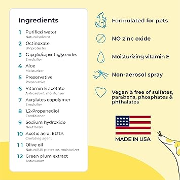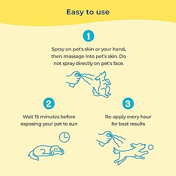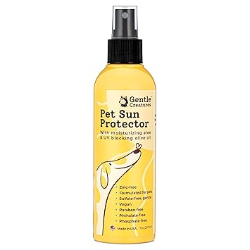 Gentle Creatures pet sunscreen is custom formulated with chemical and natural sunscreens that provide SPF against the sun's UV rays. The formula also includes moisturizers and conditioners to keep your dog or cat's coat beautiful while protecting against the sun. Apply 20 minutes before sun exposure for the best results. It's best to avoid long exposure to the sun, but if you plan to spend more than an hour in the sun with your pet, make sure to reapply regularly.