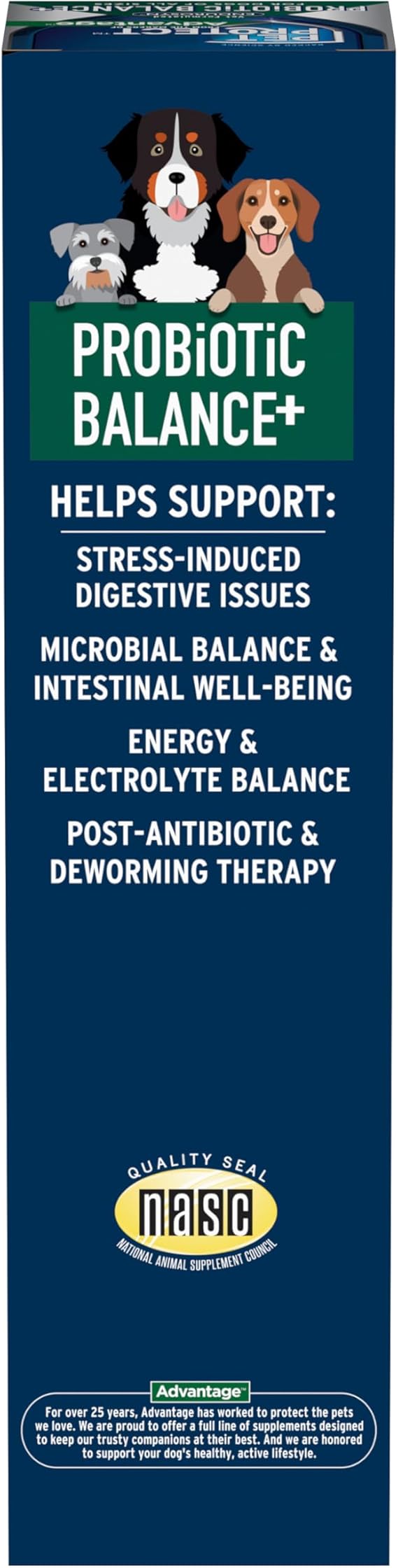 From the makers of the Advantage products you know and love, Pet Protect Probiotic Balance dog probiotics supplement is a unique, patented oral supplement to support a healthy gut. This chicken-flavored probiotic oral gel contains vet-formulated ingredients to provide advanced support for stress-induced digestive issues, microbial balance, intestinal well-being, and post-antibiotic and deworming therapy. It also helps maintain energy and electrolyte balance. Pet Protect Probiotic Balance dog supplements provide your dog with prebiotics and probiotics, amino acids, electrolytes, vitamins, fatty acids, and lactic acid bacteria to help balance the digestive system, as well as glutamine, which serves as a fuel source for cells in the small intestine and large bowels. This supplement is easy to give: simply give your dog this chicken-flavored oral gel during or after a meal. The full Pet Protect family of products is backed by science, providing powerful solutions that are recommended to support your pet's everyday needs. Pet Protect offers solutions to support strong joints, healthy digestion, and overall wellness. Pet Protect Probiotic Balance supplement uses the same vet-formulated Endurosyn formula that has been sold in vet clinics to provide ongoing digestive health and probiotics for dogs. Dog vitamins and supplements like Pet Protect Probiotic Balance can help support your furry friend's digestive needs, helping them live the life they deserve.