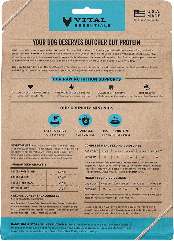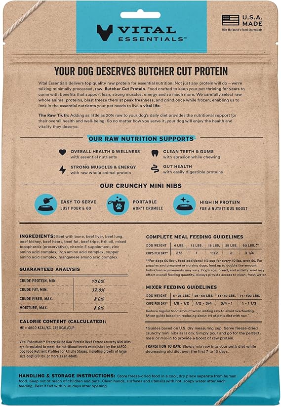 When it comes to feeding your dog a raw diet, superior protein provides superior benefits. Vital Essentials Freeze Dried Raw Turkey Dog Food Mini Nibs are packed with premium butcher cut raw protein, responsibly sourced and humanely harvested, to support your dog's overall health and wellness. Whole animal protein from muscle, organs, and bone marrow delivers lean, strong muscles and energy, digestive health, and clean teeth and gums in every bowl, keeping your pet looking and feeling their best. With Vital Essentials, you can feed raw with confidence and ease, and give your dog the health and vitality they deserve.