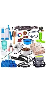- SUPER VALUE PACK - 39 in 1 puppy daily essential kit.Contains: a pet blanket | a dog leash | 2 collar | 2 steel dog bowl | a pet grooming brushes | a dog nail clippers | a dog travel bowls | 7 dog toys | 3 toothbrush | a dog treat pouches | a dog hair removal brush | a dog water bottles | 16 roll garbage bags (120 waste bags in total)