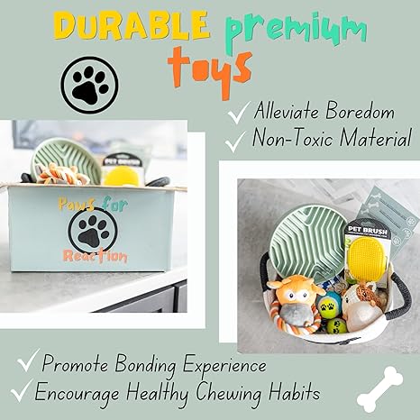 - HIGH QUALITY AND NON-TOXIC MATERIALS: Our premium Puppy Gift Basket features items made from high-quality, non-toxic materials, ensuring the safety and durability of all included toys and accessories. Perfect for your new puppy or as a thoughtful Dog Gift Basket.