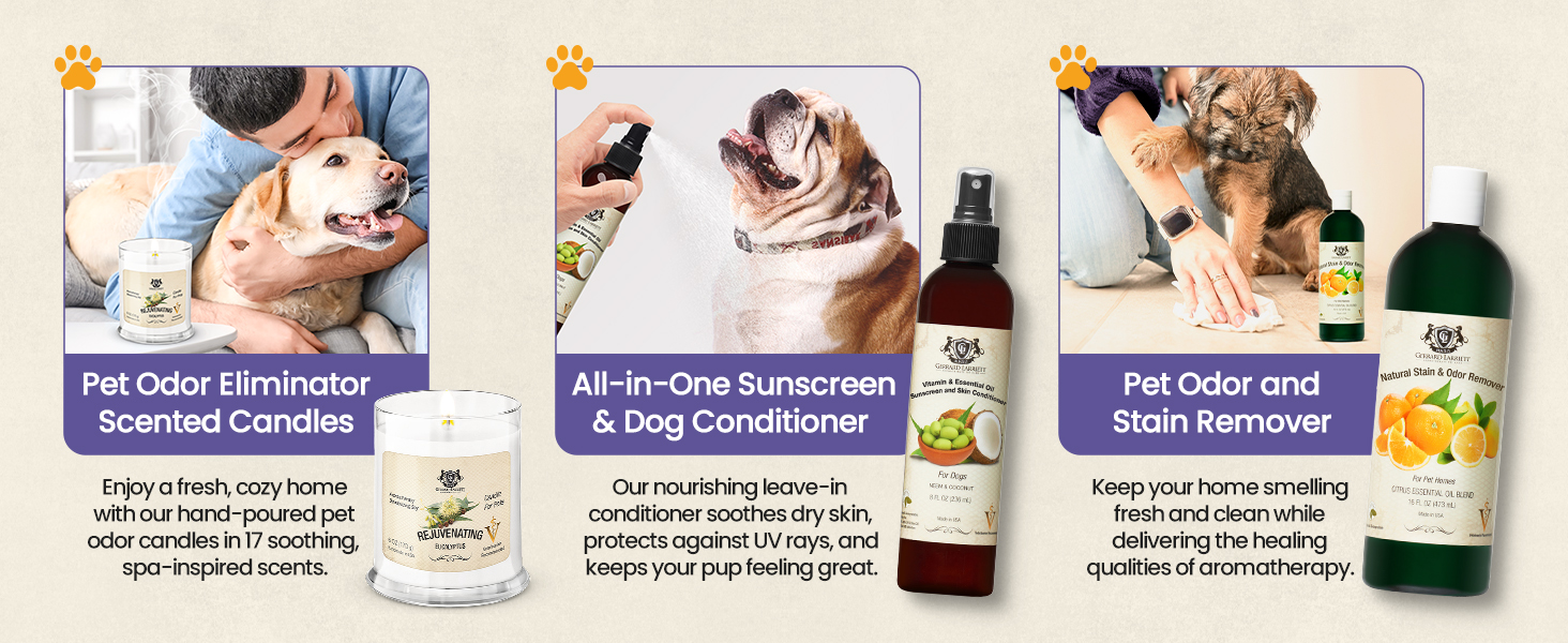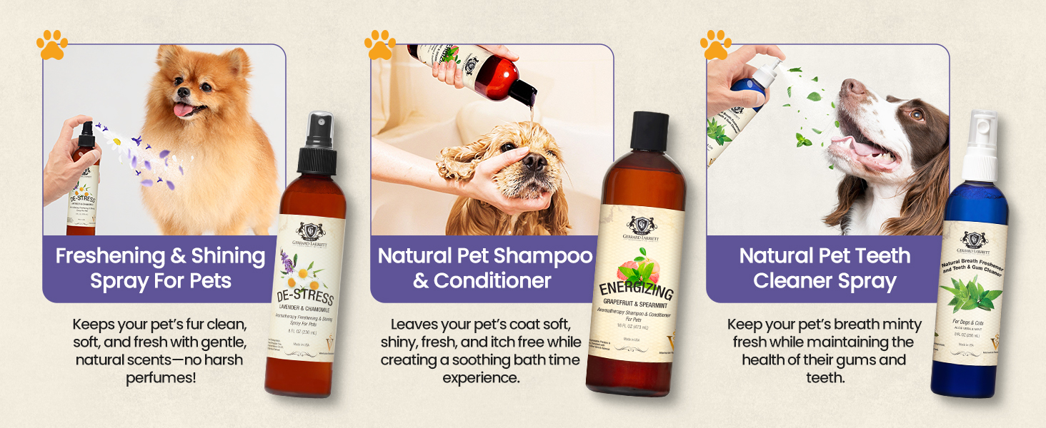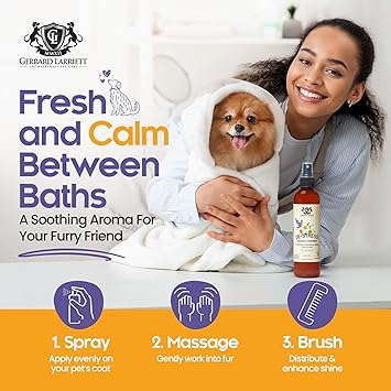 - SAFE AND GENTLE FOR ALL PETS: Gerrard Larriett Aromatherapy Pet Care pet perfume for dogs features a formula free of harsh chemicals and dyes, making it suitable for sensitive skin. Whether you’re applying it as a puppy cologne or doggie perfume spray, it’s safe for pets of all breeds and ages. Use this calming spray for dogs daily without worry for a pet friendly fragrance boost.