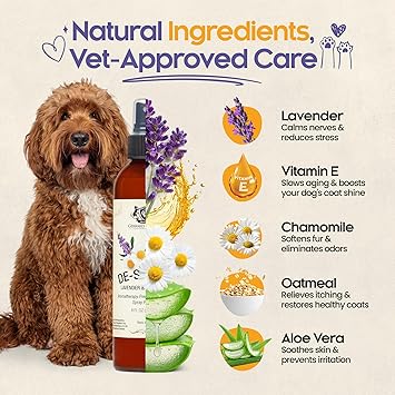 - NATURAL INGREDIENTS FOR FRESHNESS: Crafted with chamomile and lavender essential oils, our dog perfume lavender spray for dogs is the ideal way to freshen up your pet. Use it as a dog refresher spray or puppy perfume for small dogs to maintain a clean, light scent after every bath or grooming session. Your furry friend will love the soothing touch of this dog lavender spray that pampers their coat.