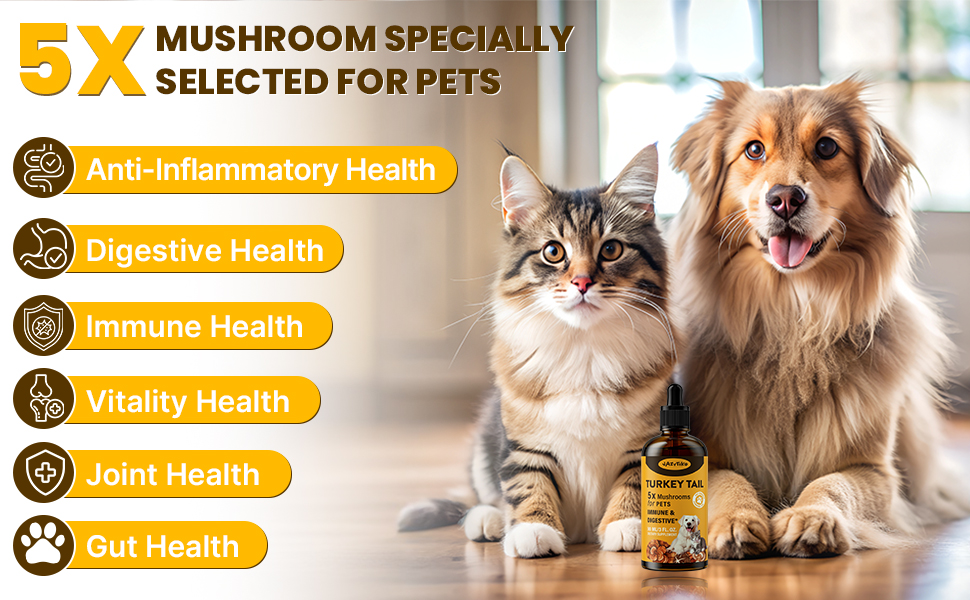 - Turkey Tail Mushroom For Your Pet’s Immune System: Rich in antioxidants this mushrooms for dogs supports your pets guards against lumps & bumps, these turkey tail mushroom for dogs feature a veterinarian formula that is formulated with 5- in-1 mushroom, probiotics and turmeric for comprehensive immune & digestive & joint and overall wellness, to keep them active and healthy