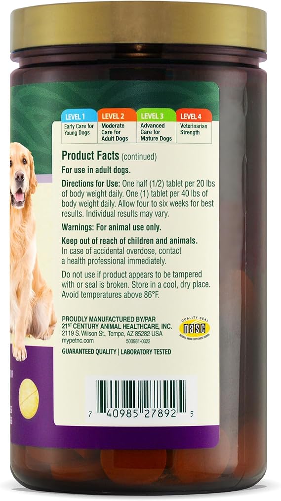 Directions for use include giving 1/2 tablet per 20 lbs or 1 tablet per 40 lbs of body weight daily. Best results are typically observed after four to six weeks, although individual outcomes may vary. This product is designed for adult dogs only and should be administered during or after meals to minimize the incidence of gastrointestinal upset. As with any supplement, if your dog's condition worsens or doesn’t improve, consult a veterinarian.