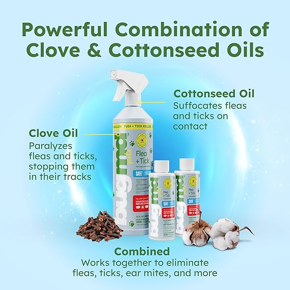 - Essential Oil Powered Formula: Clove and cottonseed oils are plant-powered ingredients that control fleas and ticks without pills, collars, or other topical spray making it an ideal flea spray for home and outdoors.