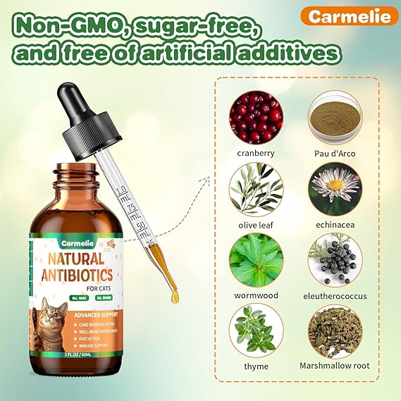 - Natural Supplement Drops:Our natural antibiotic for cats is formulated with a blend of organic ingredients, including cranberry, Pau d'Arco, olive leaf, echinacea, wormwood, eleutherococcus, thyme, and oregano. It contains no artificial additives, is Non-GMO, sugar-free, and completely natural and safe. Designed to promote the well-being of your feline companion.