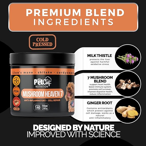 Pet Chef Premium 7 Mushrooms for dogs. Premium Mushroom Blend: Turkey Tail, Maitake, Lion's Mane & More- Detox All Dogs. Milk Thistle & Ginger Root-140 Count-Natural & Organic. Cellular Level Benefits