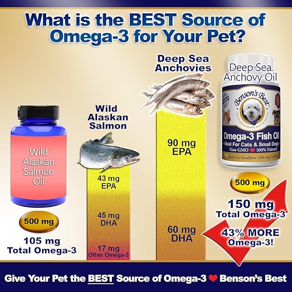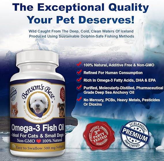 Benson's Best Omega 3 Fish Oil for Cats & Small Dogs - 200 Softgels 500mg - 43% More Omega 3 Fatty Acids Than Salmon Oil - 100% Pure, Non-GMO, Natural Pet Food Dog Fish Oil Supplements