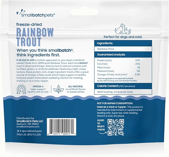 - 100% Single Ingredient Fish Treats: These light, crispy treats for dogs and cats are made from 100% pure Rainbow Trout. Each Smallbatch Pets treat is freeze-dried to lock in natural nutrients.