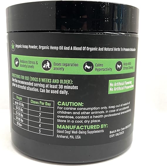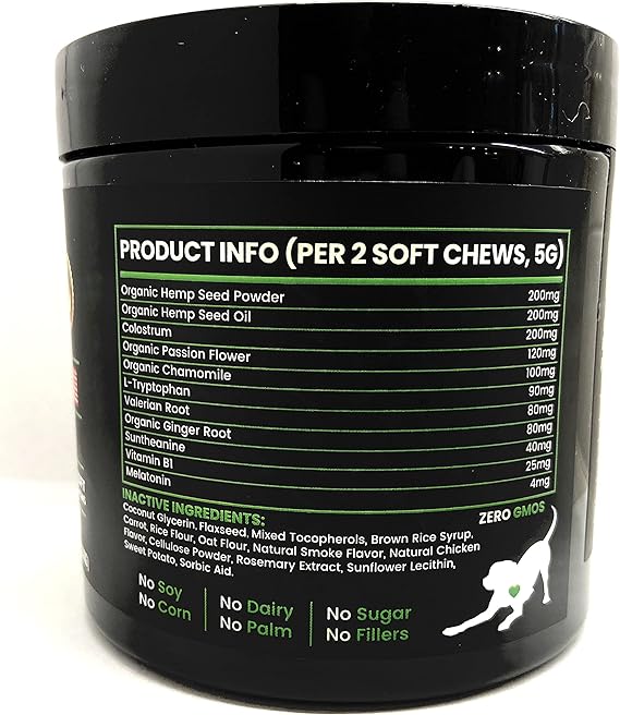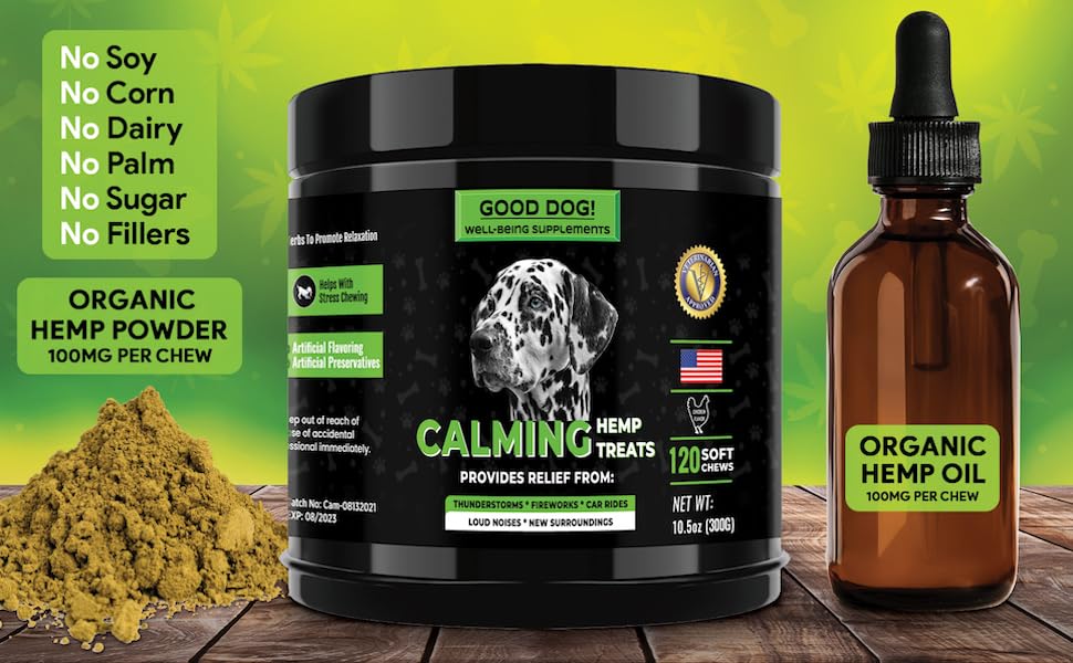 - A safe way to calm your dog with organic hemp: These calming aid supplement chews are easy to give your dog and will help combat anxious behavior. Using natural ingredients like valerian root, ginger, and organic chamomile these chews are great for dogs exhibiting nervousness, hyperactivity, discontentment or environmentally-induced stress.