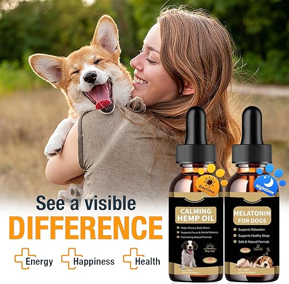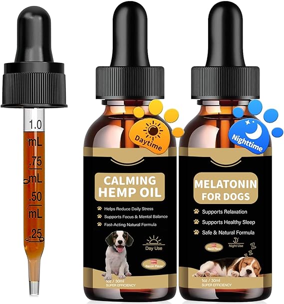 Hemp Oil & Melatonin for Dogs, Day & Night Calming Drops Support Set, Helps with Anxiety, Stress, Aggression, Separation, Relaxation & Sleep Aid