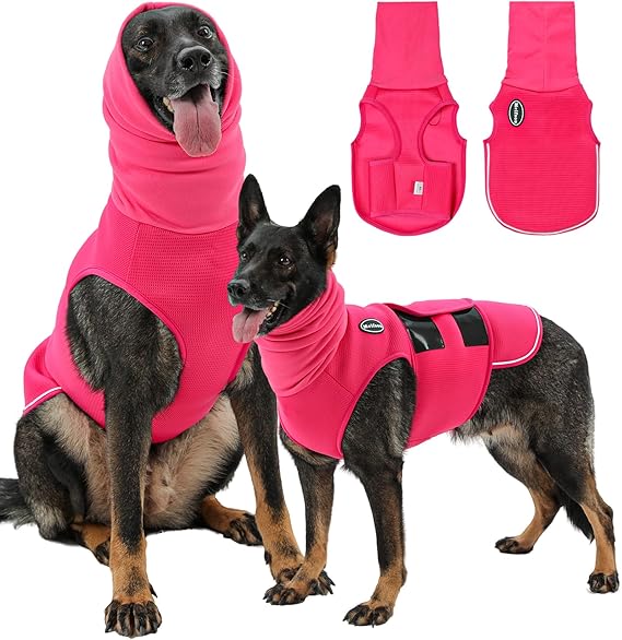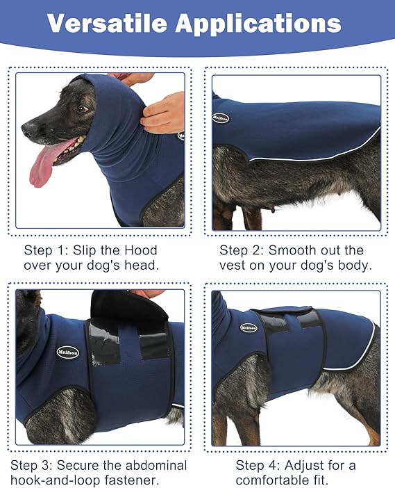 - 【INSTANT CALM: FULL-COVERAGE ANXIETY RELIEF FOR DOG】 - This innovative all-in-one dog anxiety vest with hoodie provides dual anti-anxiety benefits for dog. The body section features two straps with hook and loop fasteners that extend from the abdomen to the back, applying gentle, constant pressure reminiscent of a mother's embrace. The elastic noise-reducing dog ear muffs covers the dog's head and ears, creating a sense of security through "hiding." Provides complete comfort in anxious moments