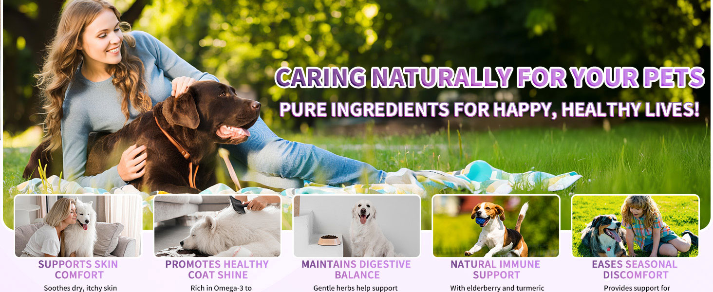 - Natural Herbal Support: Infused with turmeric, elderberry extract, evening primrose oil, and biotin, the natural supplements help maintain healthy skin, reduce coat shedding, relieve itching, and soothe seasonal skin sensitivities