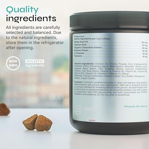 - HEMP CALMING CHEWS FOR DOGS: Pamper your pet with our sophisticated soft calming treats for dogs. Expertly crafted to help with vet visits, nail trimming, thunderstorms, and car rides, ensuring your esteemed pet's comfort