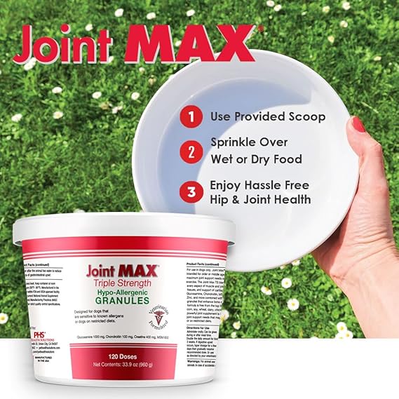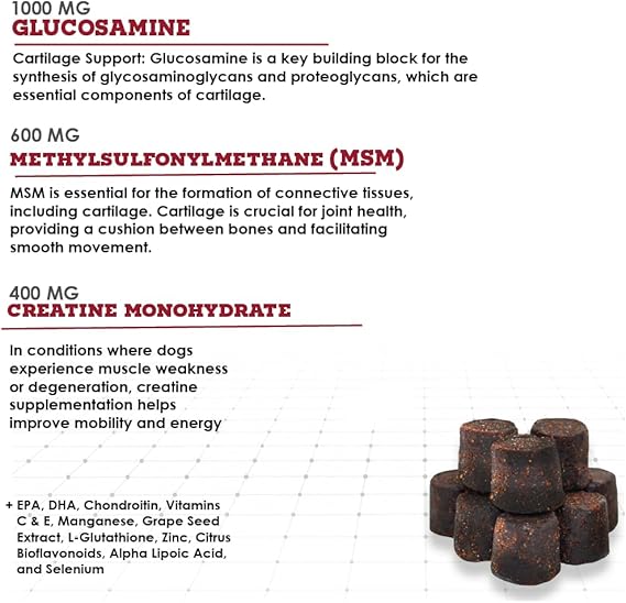 - Maximum Strength Joint Support - Delivers 1,000 mg Glucosamine, 100 mg Chondroitin, and 600 mg MSM per scoop, plus Creatine, Omega-3 fatty acids, and essential vitamins & minerals to support cartilage health, joint lubrication, and mobility in dogs of all sizes.