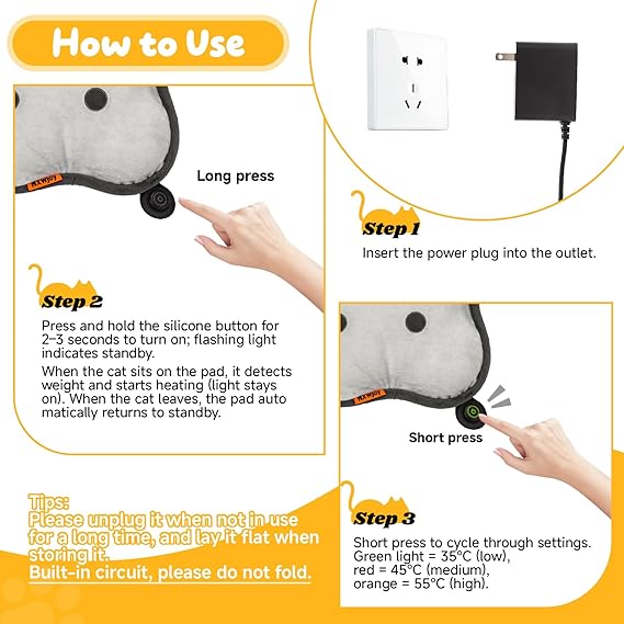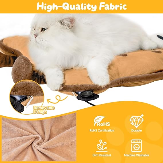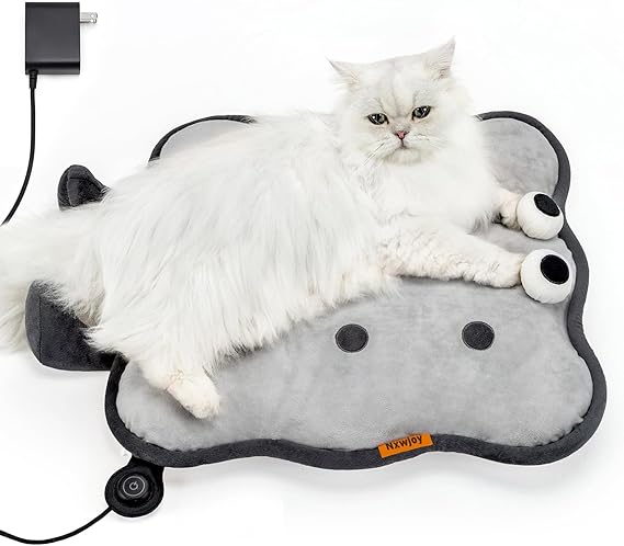 Nxwjoy cat heating pad uses 12V low voltage with nylon-braided, bite-resistant wire to prevent electric shock and ensure pet safety. Simple 3-level temperature control: press and hold the silicone button about 2~3s to turn on/off, short press to cycle through settings. Green light = 35°C (low), red = 45°C (medium), orange = 55°C (high). Heats automatically by gravity induction — flashing light indicates standby, steady light means heating. The cat heating pad uses a high-quality heating wire to achieve rapid temperature rise, 10s can feel the temperature change, and the 10min can reach the set temperature; the heating plate built-in NTC, the temperature exceeds the set temperature will pause the heating, safe and reliable, to ensure that cats can be assured of a long time to lie down and rest. Nxwjoy's cute and stylish heated cat bed adds a charming decorative touch to your home. The outer cover is made of soft, durable crystal velvet fabric that's scratch-resistant and certified ROHS-REACH compliant. Its removable and machine-washable design makes maintenance easy and helps extend the product's lifespan. The Nxwjoy Dog & Cat Heating Pad is designed to provide gentle, soothing warmth for newborn and pregnant pets, helping them stay comfortable and secure. It also provides relief from joint pressure and pain in older animals with arthritis, promoting improved mobility and overall well-being. Perfect for pets in need of extra comfort during cold weather or recovery periods. Safe, reliable, and specially crafted with your pet’s health in mind. The Nxwjoy pet heating pad is easy to use right out of the box—no installation needed. Built-in heating wire so that please do not fold it at will.