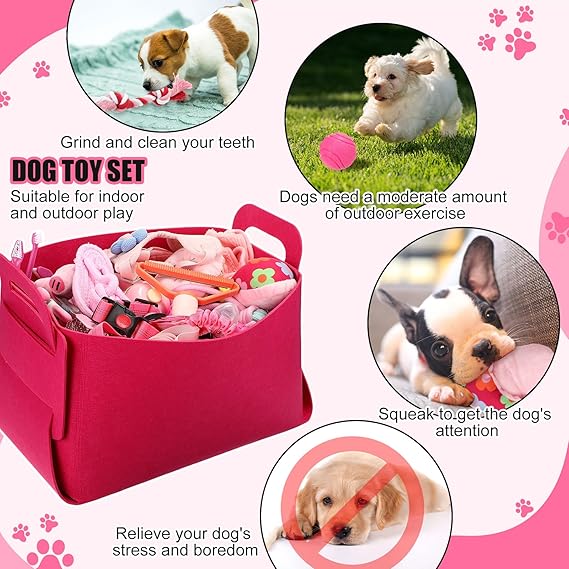 - Cute and Essential Puppy Starter Kit: Our pink themed puppy essentials starter kit is beautifully designed to fulfil both functional needs and quaint aesthetics; The comprehensive package includes 1 felt storage basket, 12 chew toys, 1 training bag, 1 dog leash, 1 TPR finger brush with case, 2 stainless steel bowls, 1 soft cotton towel, 1 pink blanket, 1 pet pad and more, ideal for female dogs